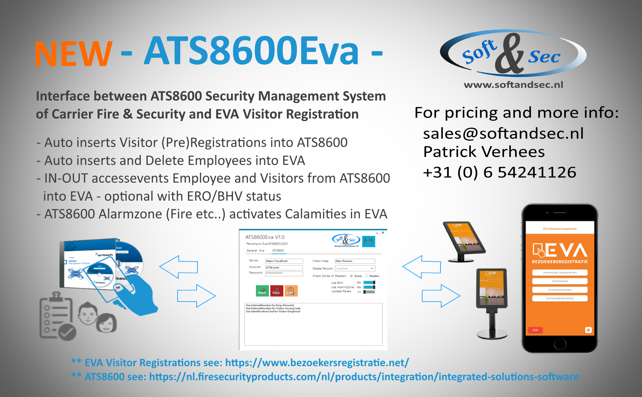 Onze partner Soft & Sec is specialist in ATS8600 integraties en heeft een integratie gebouwd waarmee bijvoorbeeld de aanwezigheidstatus van medewerkers naar EVA wordt gestuurd, toegang voor bezoekers kan worden geautomatiseerd en een brandalarmmelding in EVA een calamiteit kan activeren om de aanwezigheidsoverzichten vrij te geven.